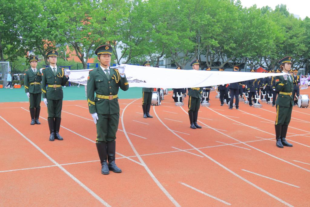 上午8點,運動會開幕式正式開始。隨著莊嚴的音樂奏響,20名國旗護衛隊隊員氣宇軒昂,腳步鏗鏘地步入會場。執行隊長王建元口令洪亮,隊員們動作整齊,目光堅定,展現出我校國旗護衛隊的專業素養。緊隨其后的是6名抬旗手,他們高舉運動會會旗,以昂揚的精神,將會旗護送至會場中心。